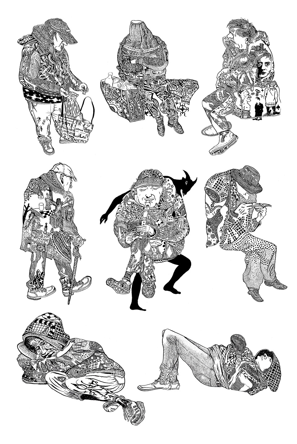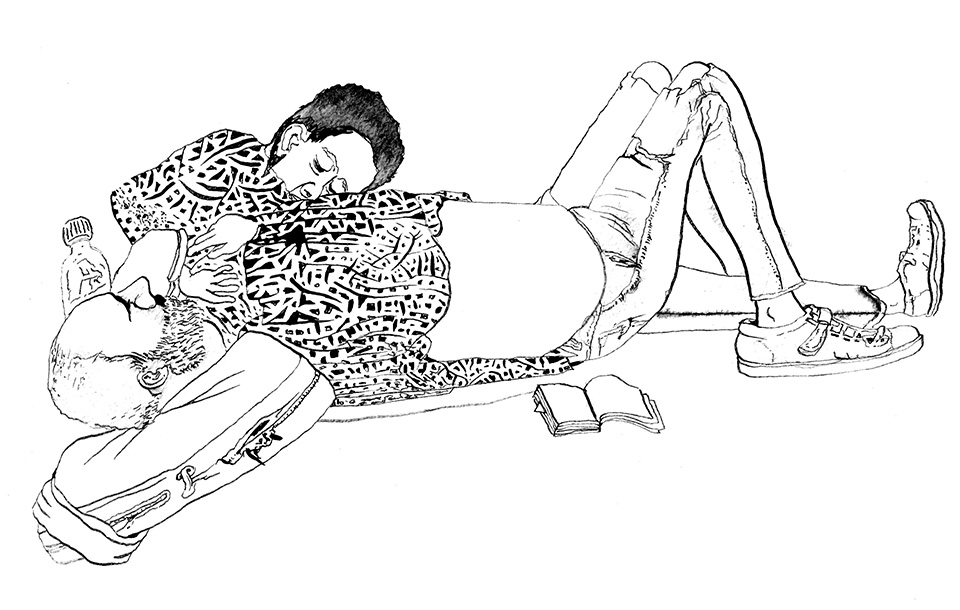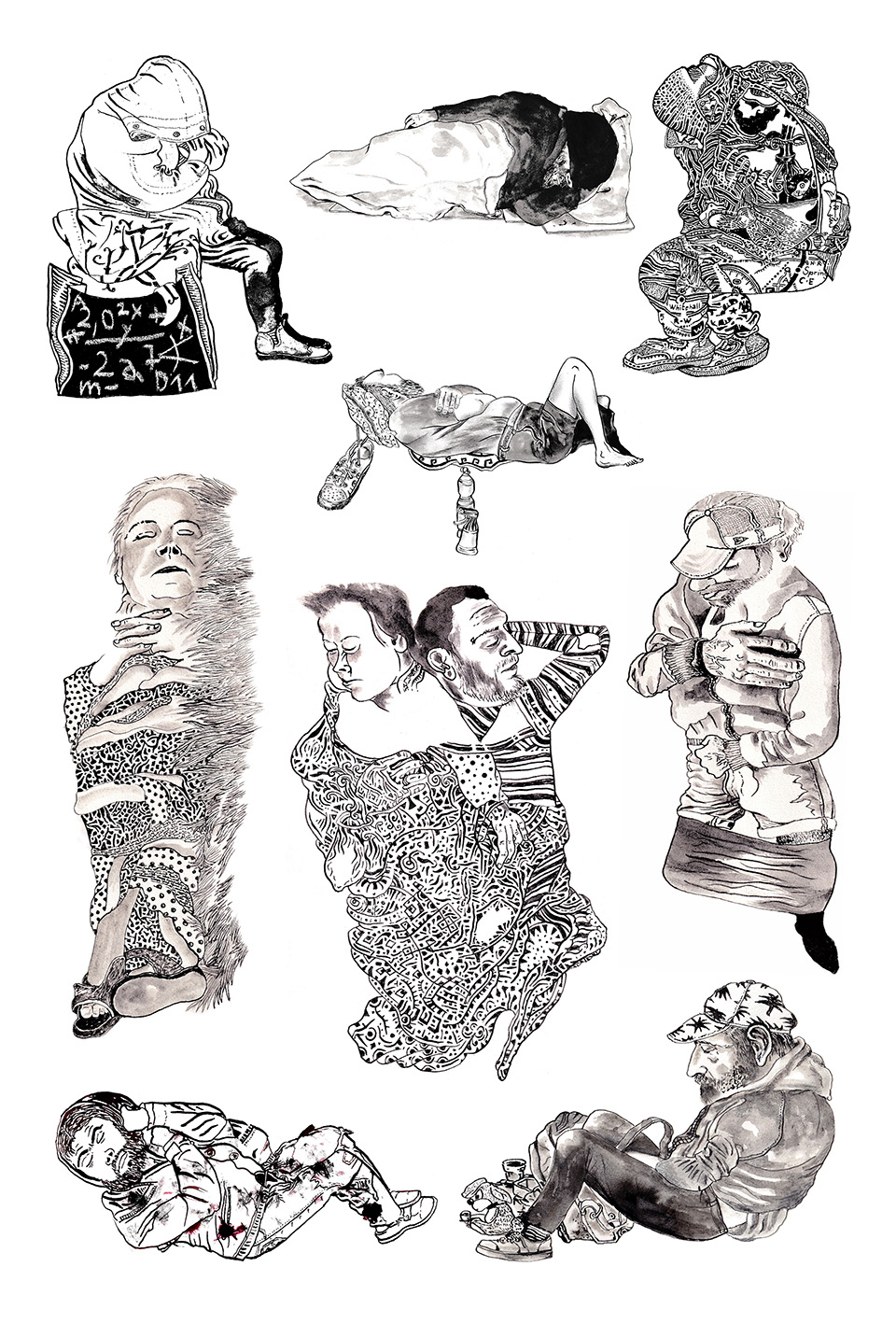 Természetesen senkinek nem érintem a tulajdonát, de szoktam hasonló hullámkartonokra is rajzolni, amilyenen hevernek, alszanak. Diszkréten – hogy semmiképp se legyek tolakodó – készítek vázlatokat róluk, amiket aztán elvonulva megrajzolok úgymond »rendesen«. Egy lendületből.