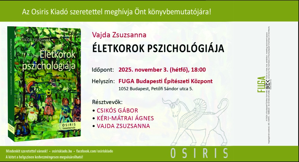 Az Osiris Kiadó szeretettel meghívja Önt Vajda Zsuzsanna Az életkorok pszichológiája című könyvének bemutatójára.